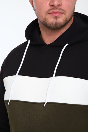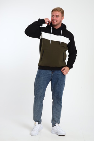 Стильная мужская толстовка с капюшоном выполнена из футера трёх нитки пенье компакт. Она имеет начес, что делает её идеальным выбором для прохладных дней. Капюшон регулируется шнурком. По бокам расположены вместительные карманы на молнии (кенгуру). Доступна в нескольких базовых расцветках с контрастными вставками по типу колор-блок. Первая стирка с изнаночной стороны при 30 градусах. При первой стирке ворс начеса полиняет. Это нормально.