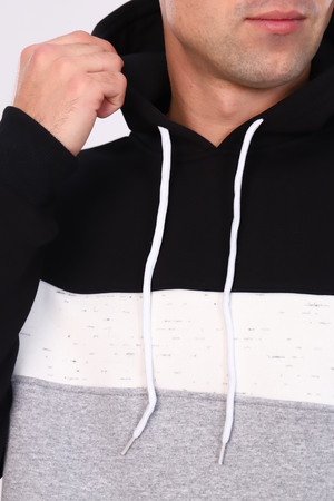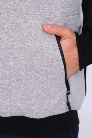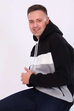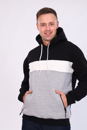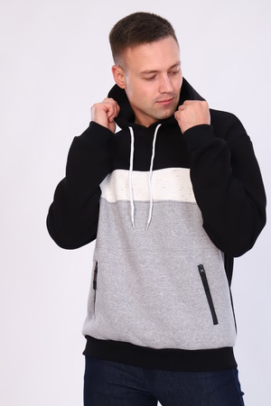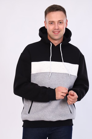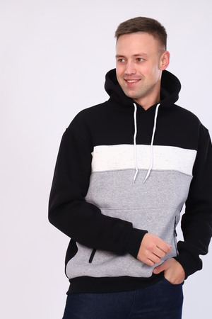 Стильная мужская толстовка с капюшоном выполнена из футера трёх нитки пенье компакт. Она имеет начес, что делает её идеальным выбором для прохладных дней. Капюшон регулируется шнурком. По бокам расположены вместительные карманы на молнии (кенгуру). Доступна в нескольких базовых расцветках с контрастными вставками по типу колор-блок. Первая стирка с изнаночной стороны при 30 градусах. При первой стирке ворс начеса полиняет. Это нормально.