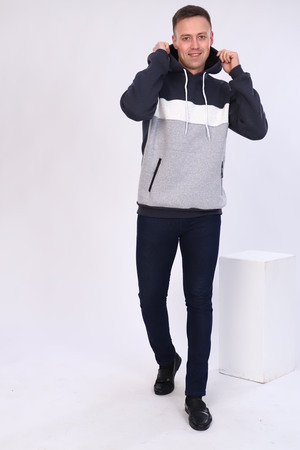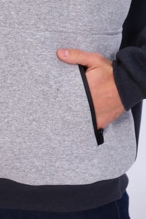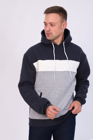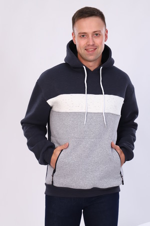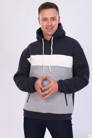 Стильная мужская толстовка с капюшоном выполнена из футера трёх нитки пенье компакт. Она имеет начес, что делает её идеальным выбором для прохладных дней. Капюшон регулируется шнурком. По бокам расположены вместительные карманы на молнии (кенгуру). Доступна в нескольких базовых расцветках с контрастными вставками по типу колор-блок. Первая стирка с изнаночной стороны при 30 градусах. При первой стирке ворс начеса полиняет. Это нормально.
