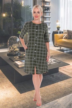 Халат женский из кулирной глади. Полочка с центральной застежкой на 6 петель и 6 пуговиц. Рукав втачной до линии локтя. Горловина окантована. На полочке расположены карманы.