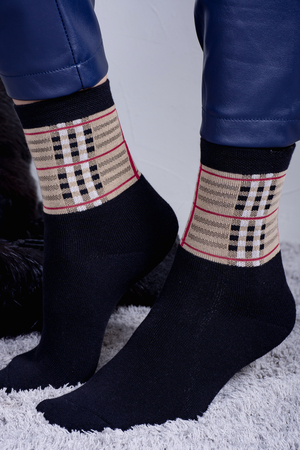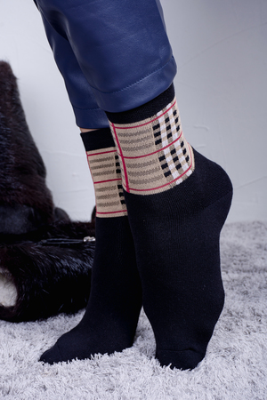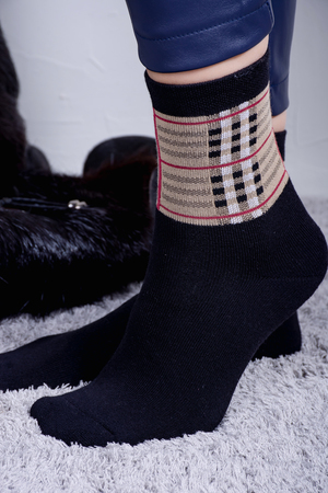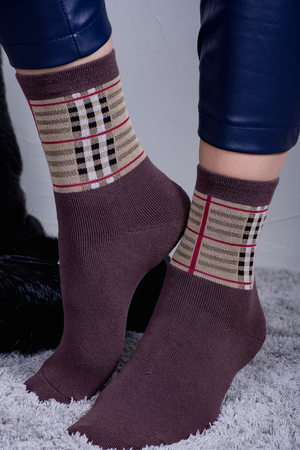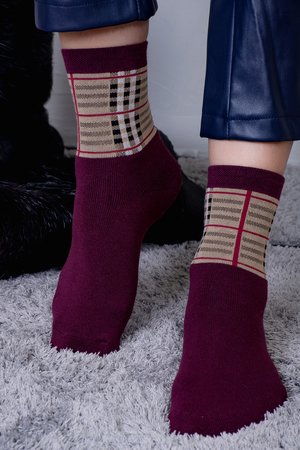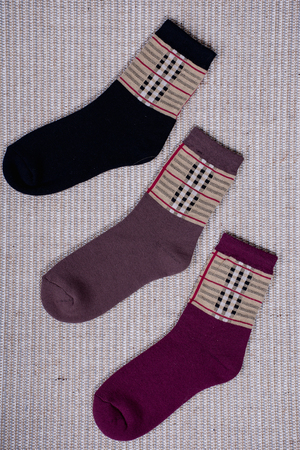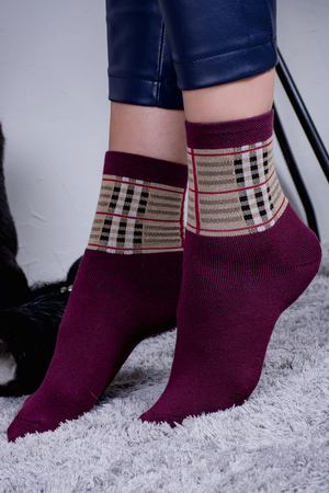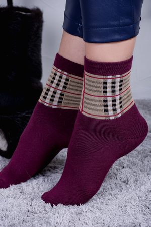 Набор женских плюшевых носков в лаконичном дизайне. По верху рисунок в виде клетки, низ однотонный. В упаковке 3 пары - по 1 паре каждой расцветки