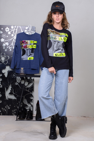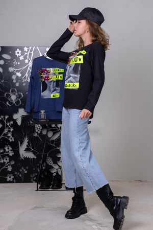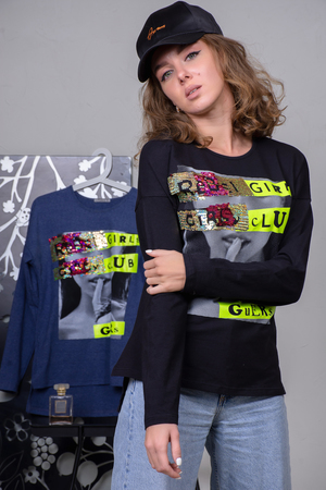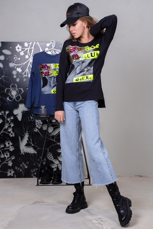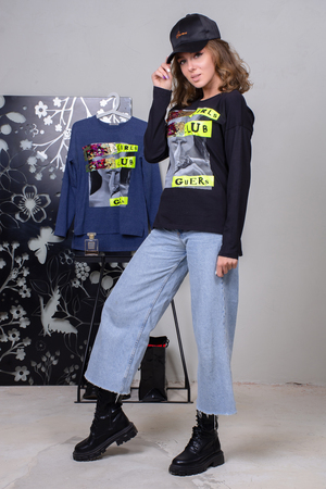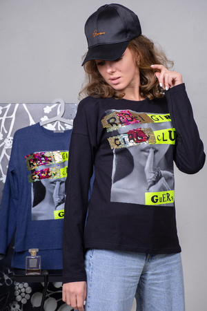 Туника полуприталенного силуэта, с удлиненной спинкой, с округлой горловиной. Рукав длинный. В нижней части боковых швов обработаны разрезы. Горловина обработана бейкой из основного полотна. Полочку украшает яркая печать с пайетками.