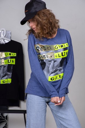 Туника полуприталенного силуэта, с удлиненной спинкой, с округлой горловиной. Рукав длинный. В нижней части боковых швов обработаны разрезы. Горловина обработана бейкой из основного полотна. Полочку украшает яркая печать с пайетками.