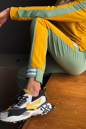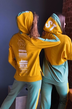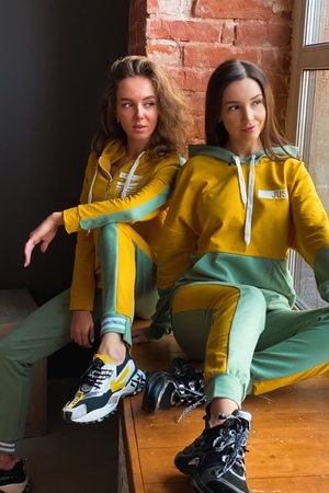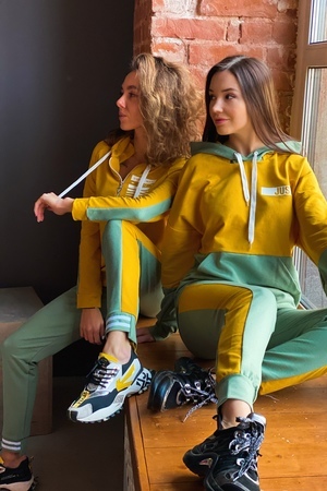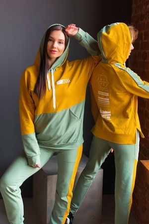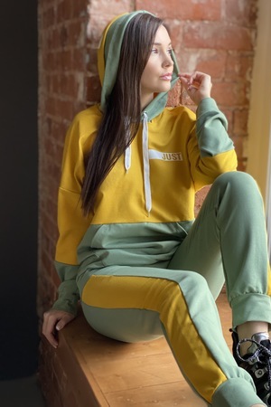 Костюм состоит из толстовки и брюк. Брюки на поясе, с карманами, с лампасами из отделочного полотна вдоль боковых швов, на манжете по низу. Толстовка прямая, свободная, с капюшоном, на поясе, длиной до середины бедра. Рукав длинный, на манжете. На полочке обработан карман "кенгуру". Верхняя часть толстовки выполнена из отделочного полотна контрастного цвета.