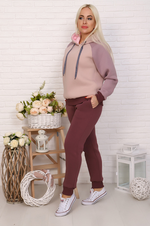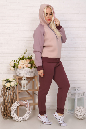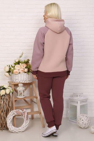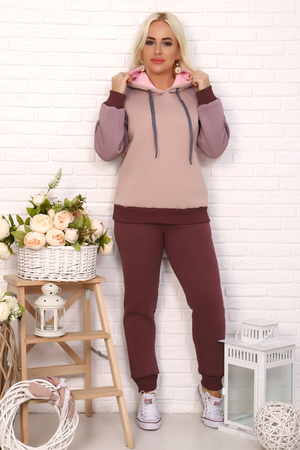 Костюм женский из футера 3-нитки с начесом, комбинированный в 3- х цветах. Кофта на поясе с капюшоном, рукав-реглан. Брюки с карманами, на манжетах. Манжеты брюк и куртки, пояс куртки- рибана.