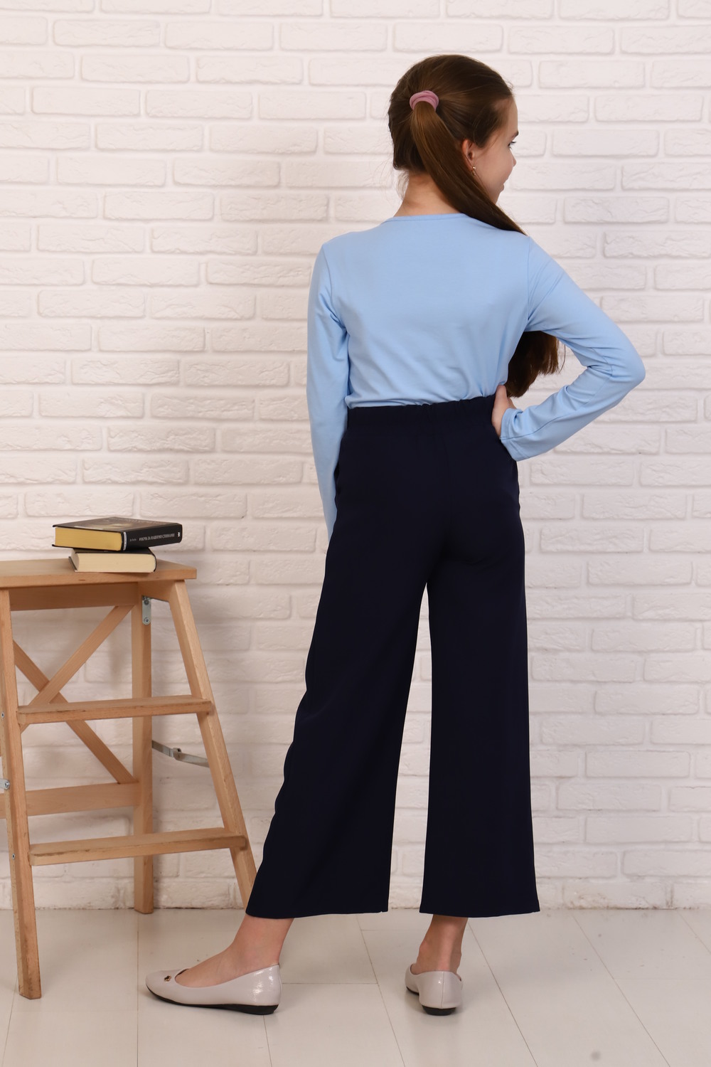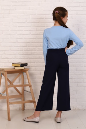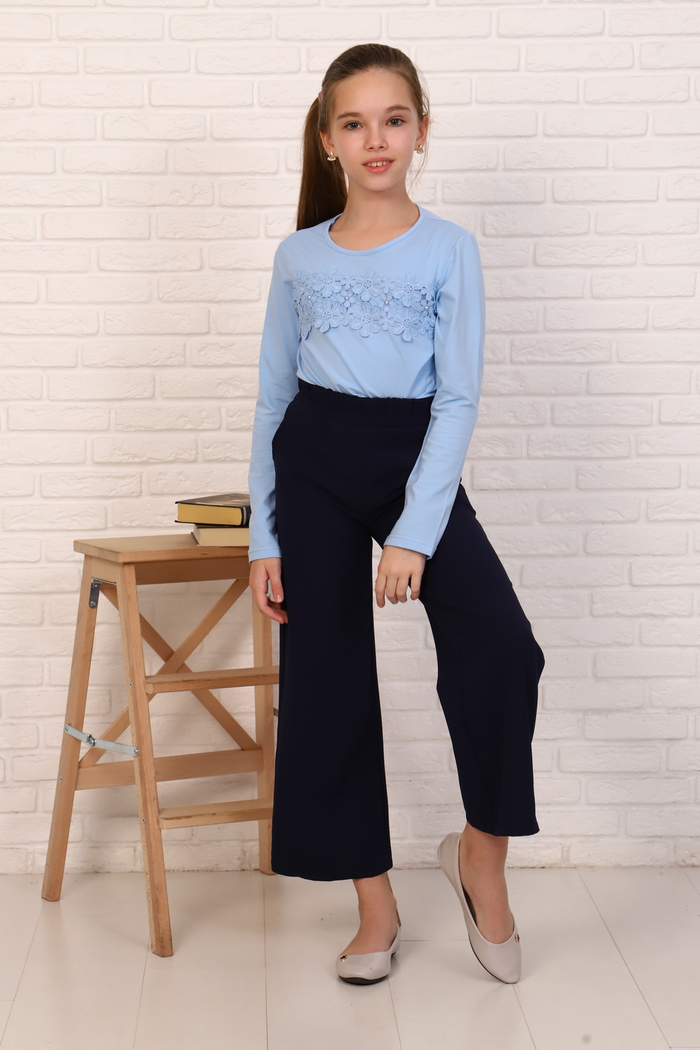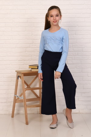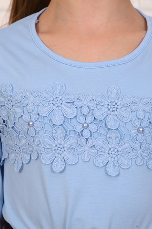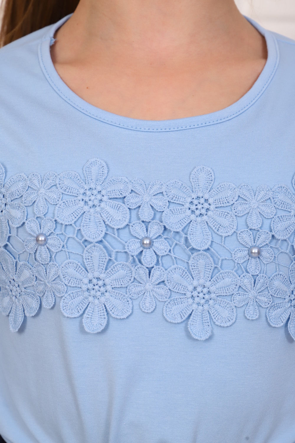 Блузка для девочек дошкольного, младшего и старшего школьного возраста, из однотонного трикотажного полотна кулирка с лайкрой. Блузка прямого силуэта, с втачным рукавом, без застежки. Спереди и на спинке отсутствуют линии членения. На передней части джемпера настрочено кружево по линии груди. Срез горловины обработан узкой окантовочной лентой из того же полотна в 4 сложения. Рукав одношовный, длинный. Низ рукава без манжеты, подогнут. На кружево приклеены 3 полубусины.