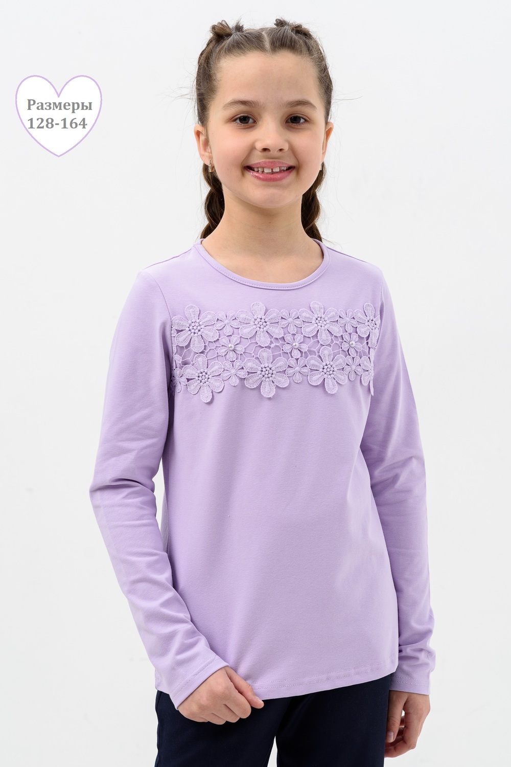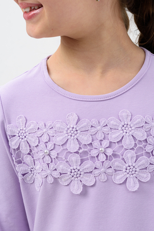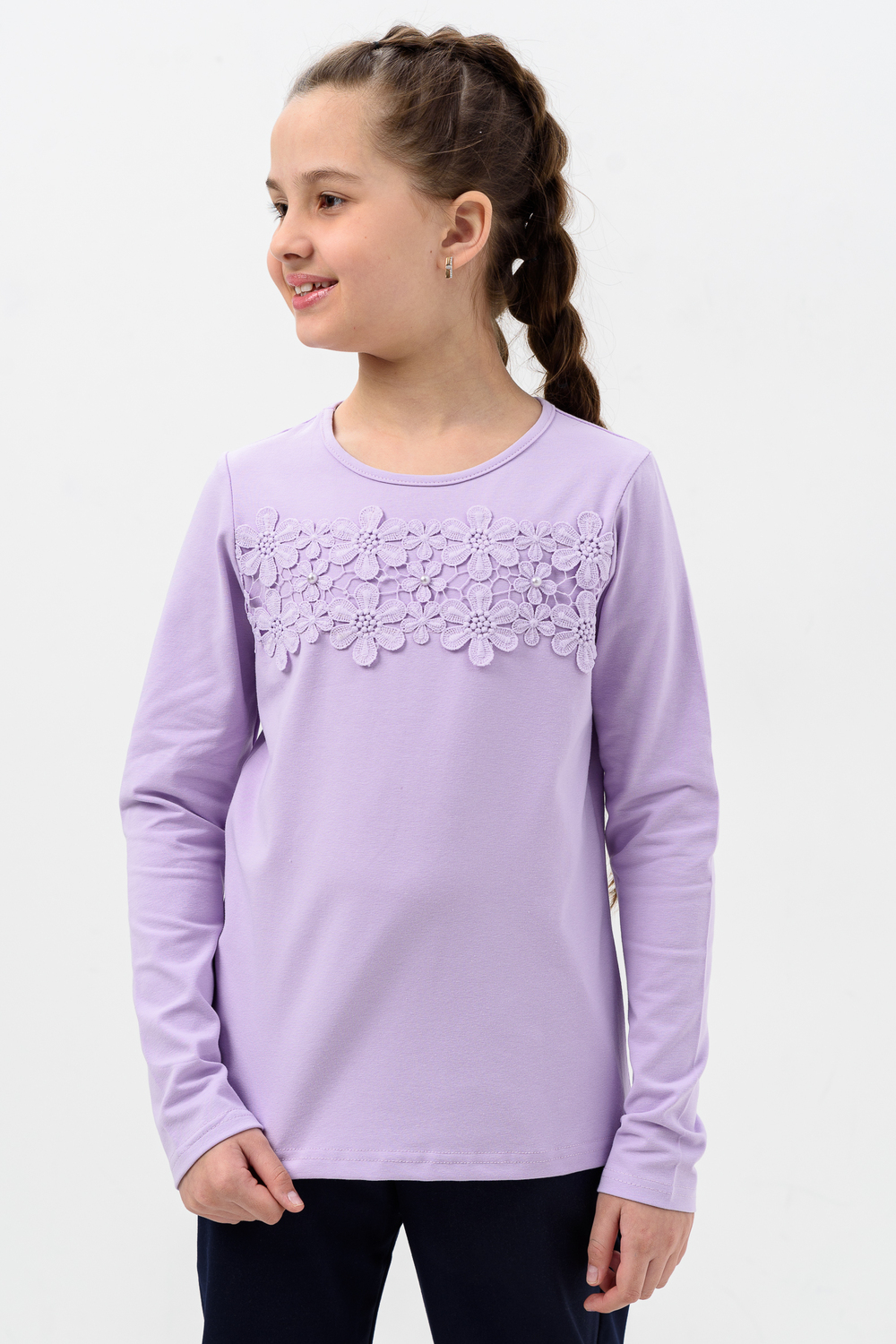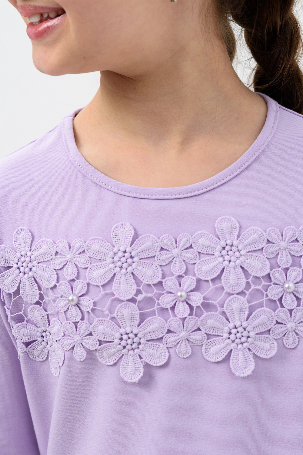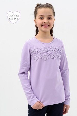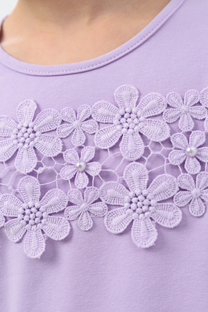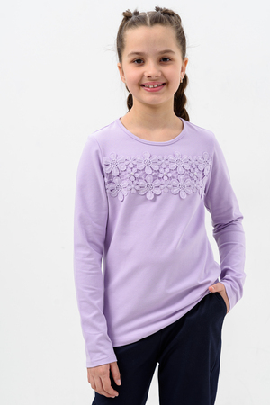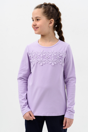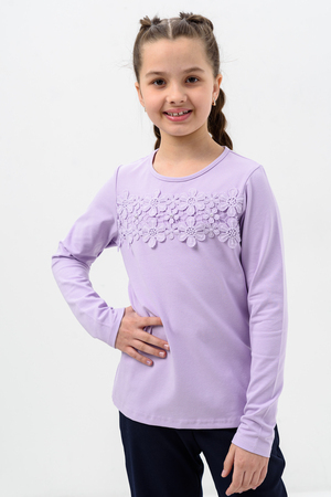 Блузка для девочек дошкольного, младшего и старшего школьного возраста, из однотонного трикотажного полотна кулирка с лайкрой. Блузка прямого силуэта, с втачным рукавом, без застежки. Спереди и на спинке отсутствуют линии членения. На передней части джемпера настрочено кружево по линии груди. Срез горловины обработан узкой окантовочной лентой из того же полотна в 4 сложения. Рукав одношовный, длинный. Низ рукава без манжеты, подогнут. На кружево приклеены 3 полубусины.