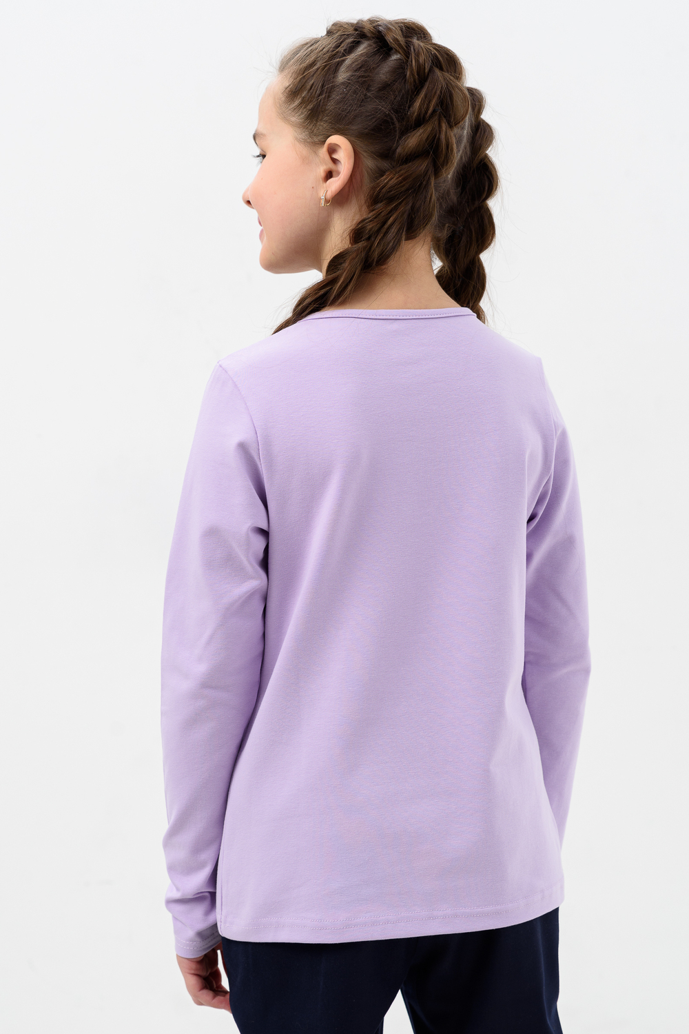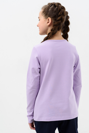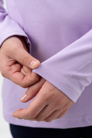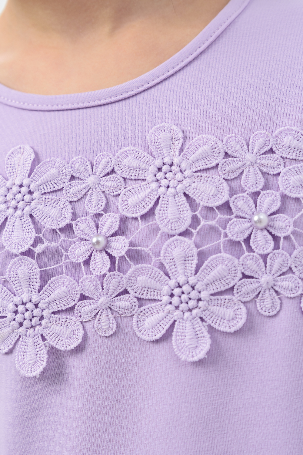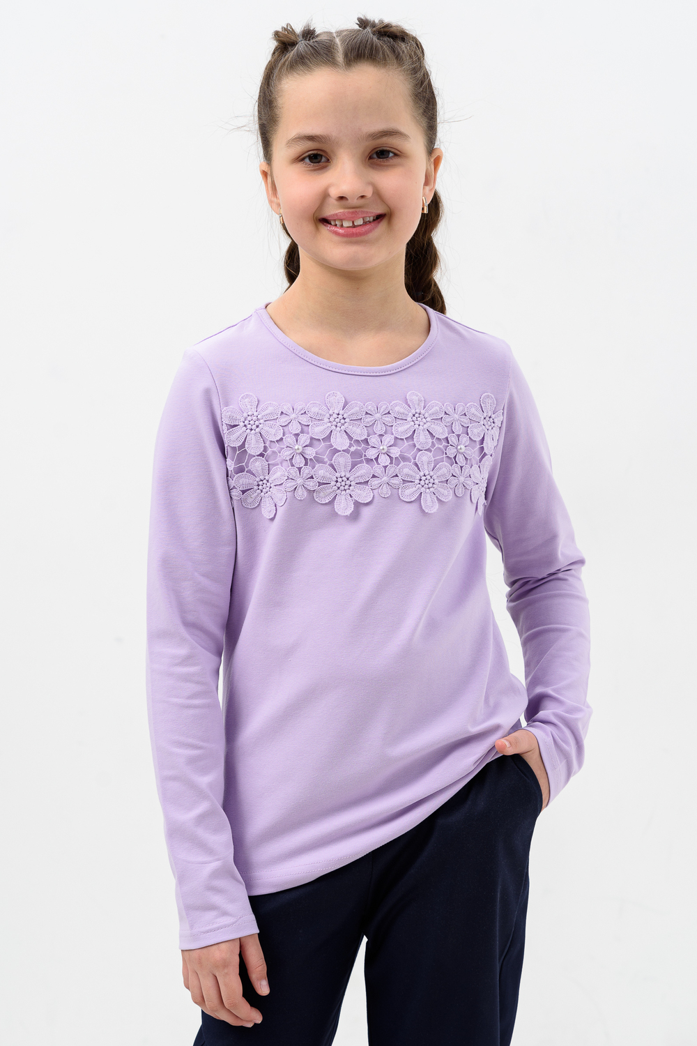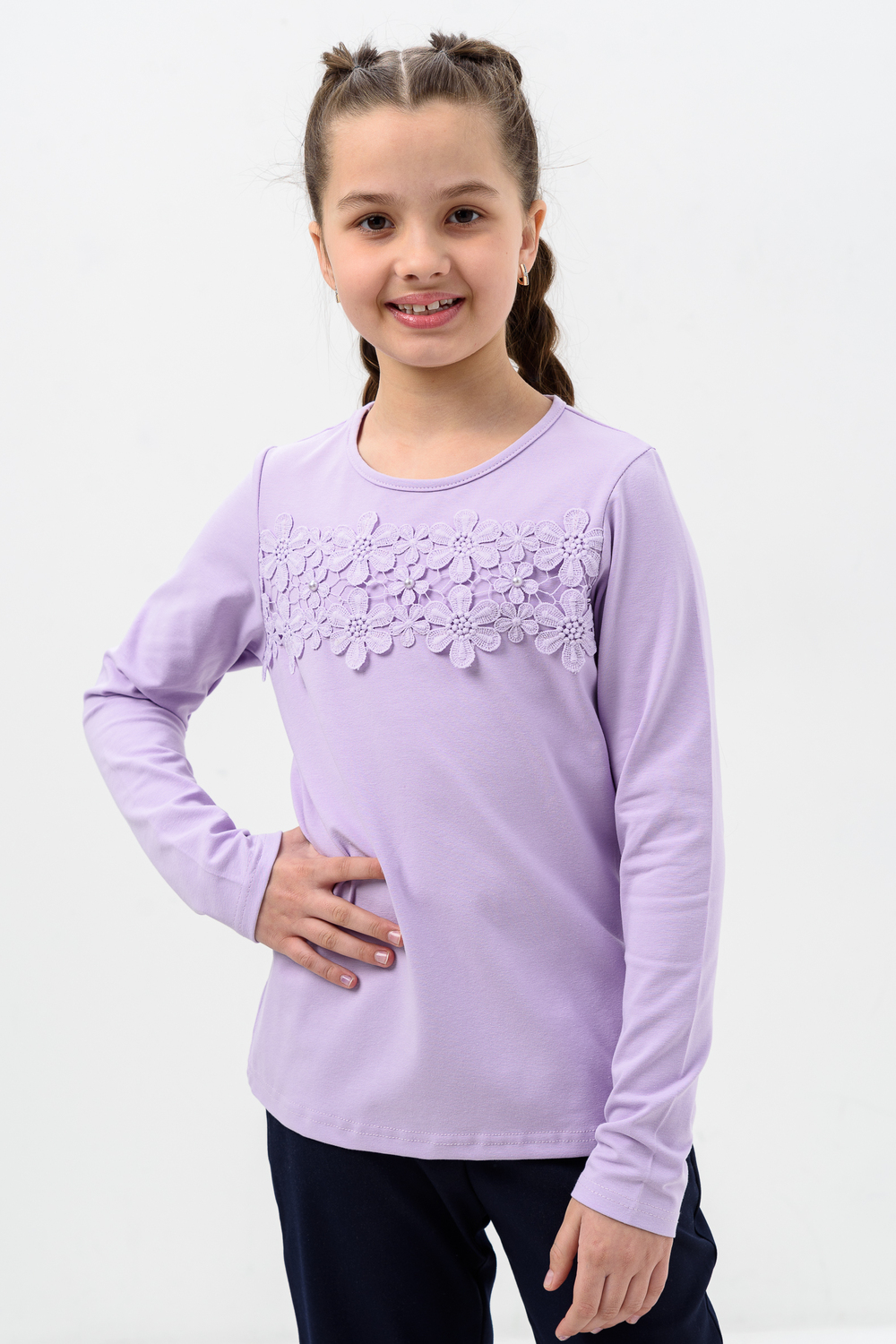 Блузка для девочек дошкольного, младшего и старшего школьного возраста, из однотонного трикотажного полотна кулирка с лайкрой. Блузка прямого силуэта, с втачным рукавом, без застежки. Спереди и на спинке отсутствуют линии членения. На передней части джемпера настрочено кружево по линии груди. Срез горловины обработан узкой окантовочной лентой из того же полотна в 4 сложения. Рукав одношовный, длинный. Низ рукава без манжеты, подогнут. На кружево приклеены 3 полубусины.