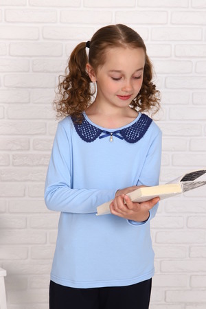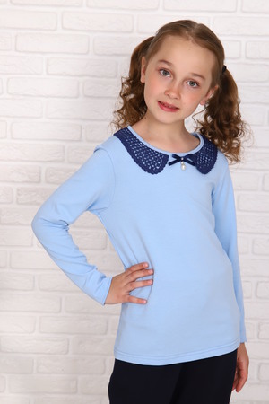 Блузка для девочек младшего и старшего школьного возраста, из трикотажного однотонного полотна – кулирка с лайкрой. Блузка полуприлегающего силуэта, с втачным длинным рукавом, с кружевным воротником, с центральной застежкой на петлю и пуговицу на спинке. Спереди отсутствуют линии членения. На спинке вырез в виде «капельки». Срез горловины и капля окантованы. Рукав одношовный. Низа рукава и изделия подогнуты. Спереди по центру горловины прикреплен декоративный элемент.