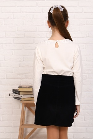 Блузка для девочек младшего и старшего школьного возраста, из трикотажного однотонного полотна – кулирка с лайкрой. Блузка полуприлегающего силуэта, с втачным длинным рукавом, с кружевным воротником, с центральной застежкой на петлю и пуговицу на спинке. Спереди отсутствуют линии членения. На спинке вырез в виде «капельки». Срез горловины и капля окантованы. Рукав одношовный. Низа рукава и изделия подогнуты. Спереди по центру горловины прикреплен декоративный элемент.