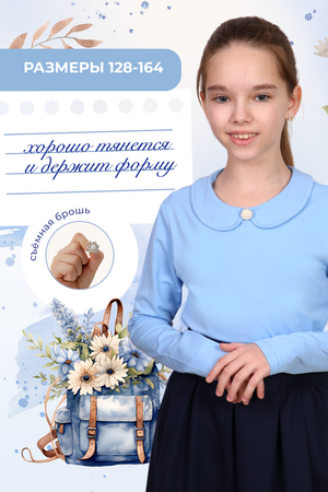 Блузка для девочек младшего и старшего школьного возраста, из трикотажного однотонного полотна – кулирка с лайкрой. Блузка полуприлегающего силуэта, с втачным длинным рукавом, без застежки, с воротником на базе плосколежащего с концами округлой формы. Спереди и на спинке отсутствуют линии членения. Круглые концы воротника обработаны узкой окантовочной лентой из того же полотна в 4 сложения. Рукав одношовный. Низа рукава и изделия подогнуты. Спереди по центру горловины прикреплена брошь.