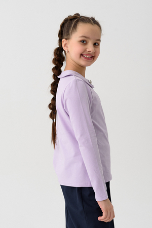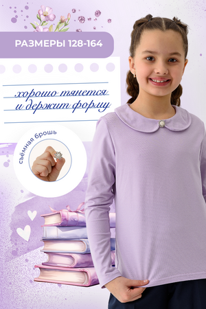 Блузка для девочек младшего и старшего школьного возраста, из трикотажного однотонного полотна – кулирка с лайкрой. Блузка полуприлегающего силуэта, с втачным длинным рукавом, без застежки, с воротником на базе плосколежащего с концами округлой формы. Спереди и на спинке отсутствуют линии членения. Круглые концы воротника обработаны узкой окантовочной лентой из того же полотна в 4 сложения. Рукав одношовный. Низа рукава и изделия подогнуты. Спереди по центру горловины прикреплена брошь.