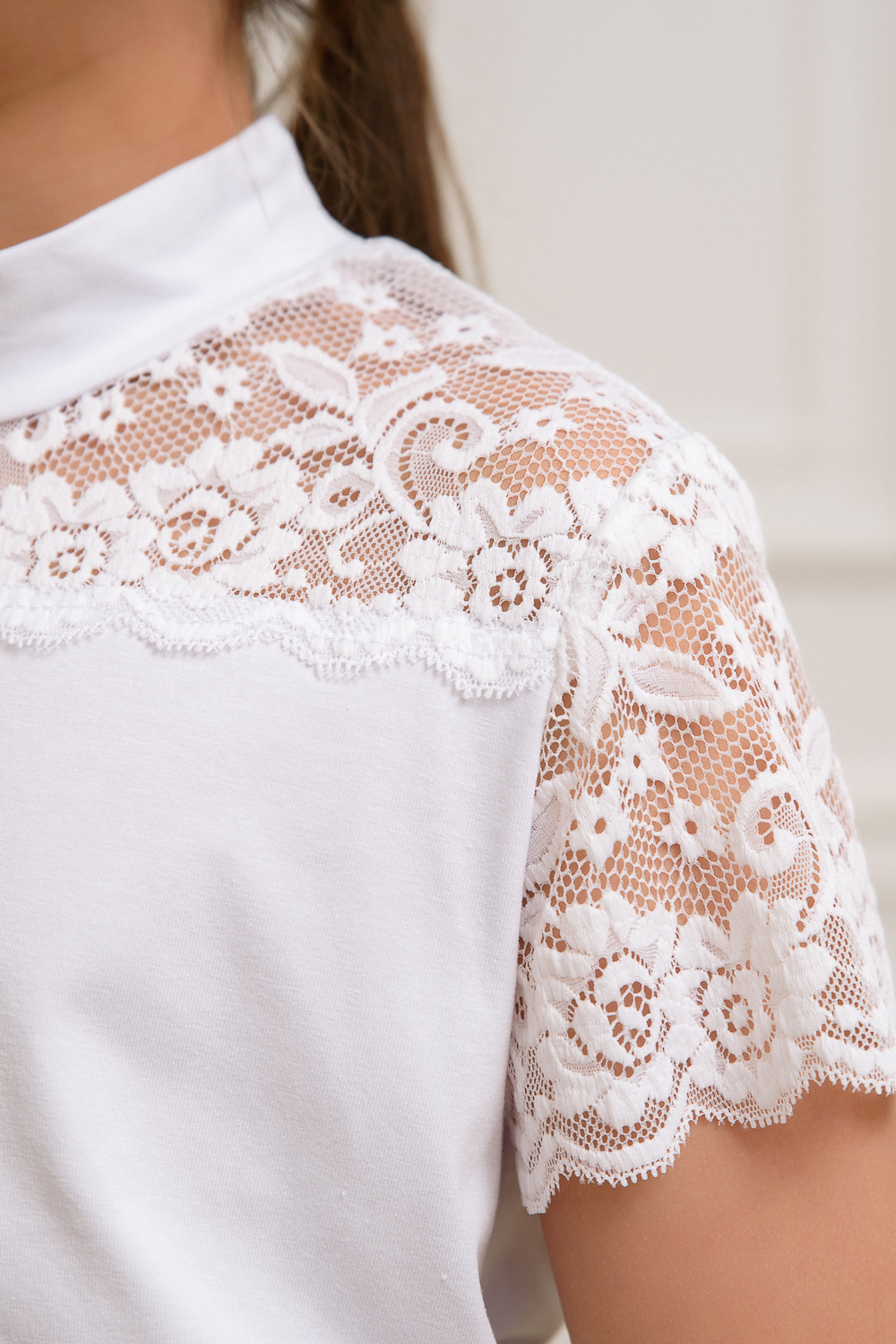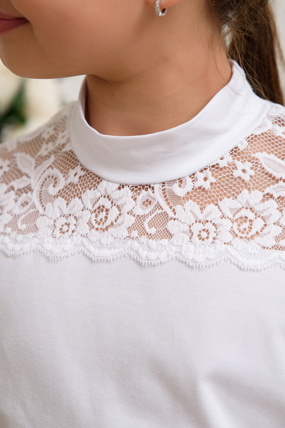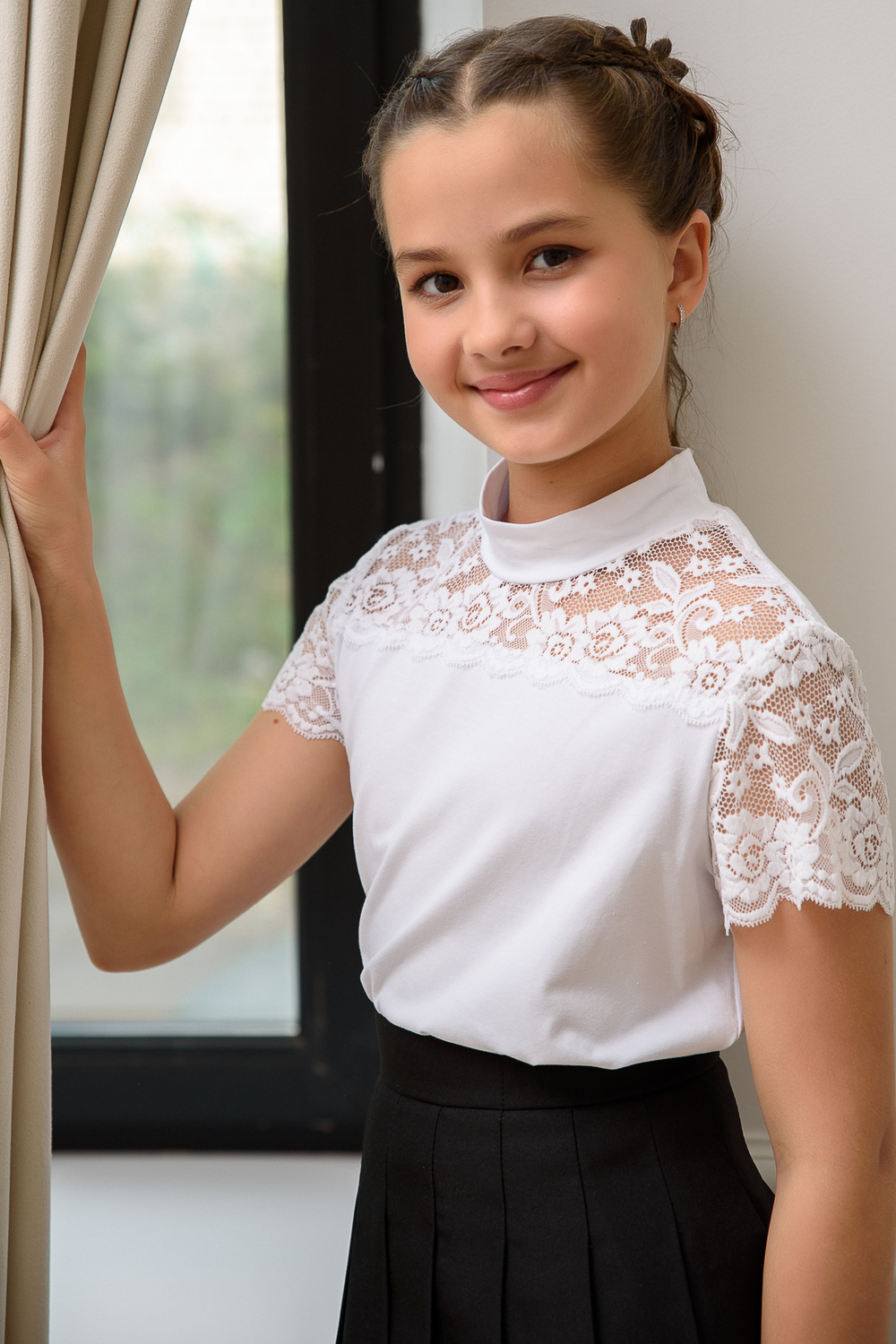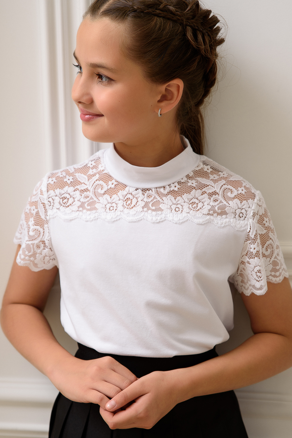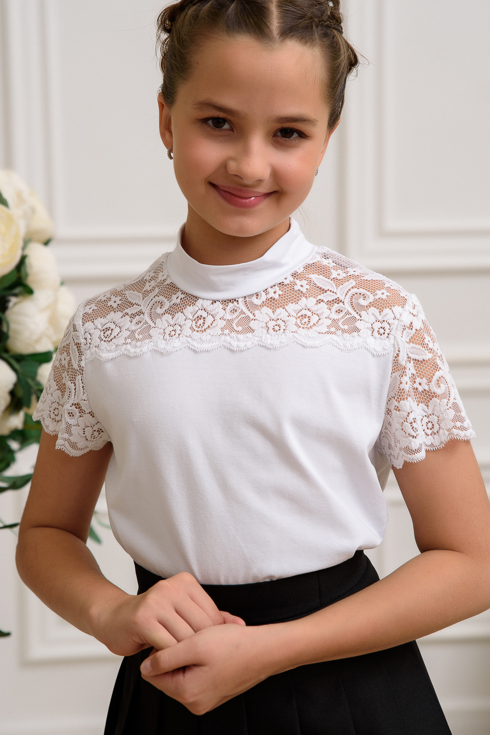 Блузка для девочек младшего и старшего школьного возраста, из трикотажного однотонного полотна – кулирка с лайкрой и эластичного кружева (дизайн и ширина кружева может меняться). Блузка полуприлегающего силуэта, с втачным коротким рукавом, с воротником – стойкой. Спереди отрезная кружевная кокетка. На спинке отсутствуют линии членения. Рукав одношовный, выполнен из эластичного кружева. Низ изделия подогнут.