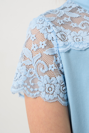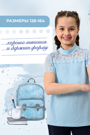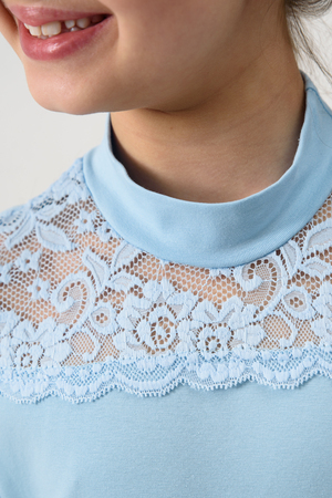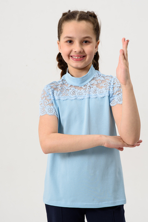 Блузка для девочек младшего и старшего школьного возраста, из трикотажного однотонного полотна – кулирка с лайкрой и эластичного кружева (дизайн и ширина кружева может меняться). Блузка полуприлегающего силуэта, с втачным коротким рукавом, с воротником – стойкой. Спереди отрезная кружевная кокетка. На спинке отсутствуют линии членения. Рукав одношовный, выполнен из эластичного кружева. Низ изделия подогнут.