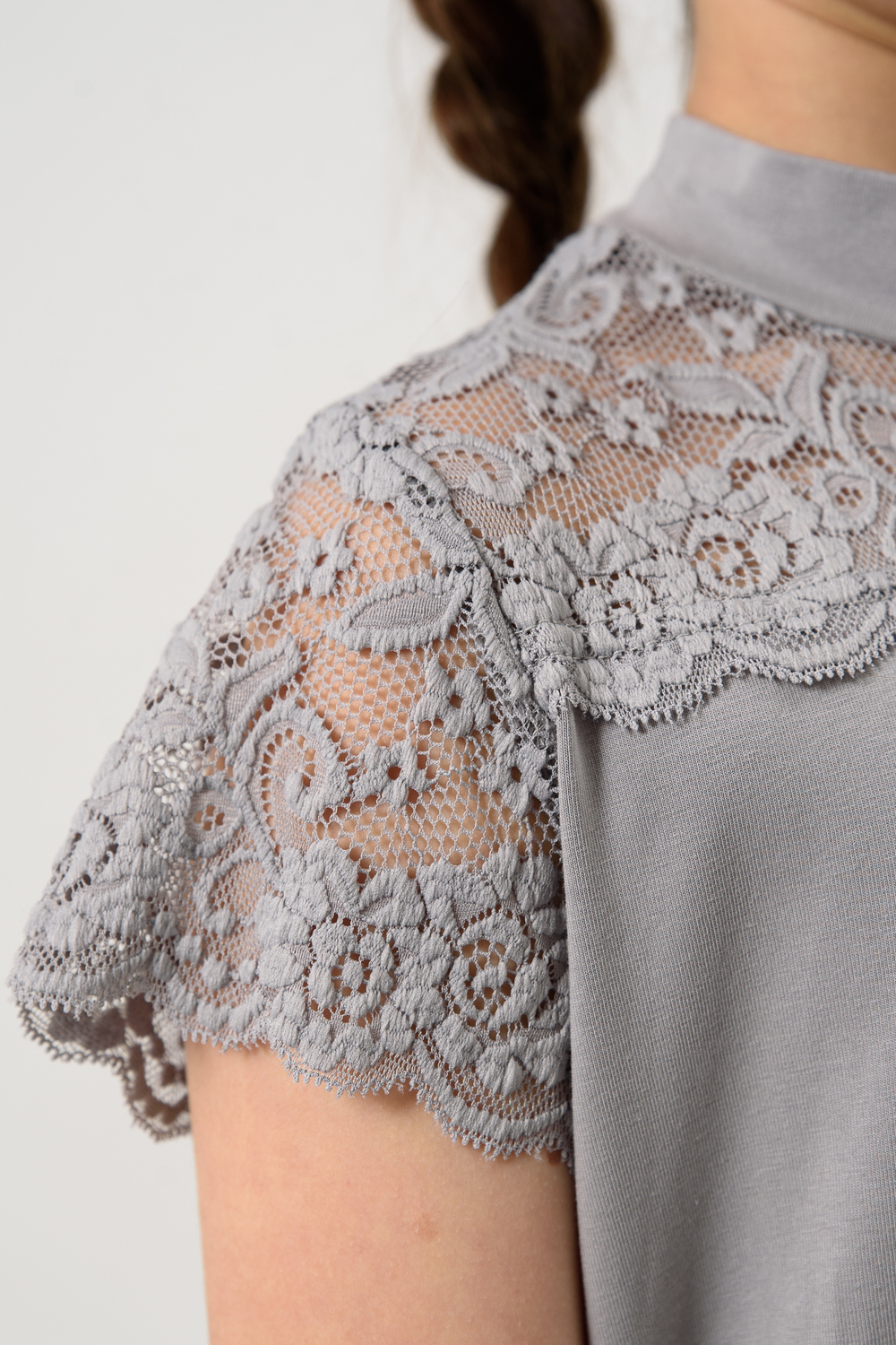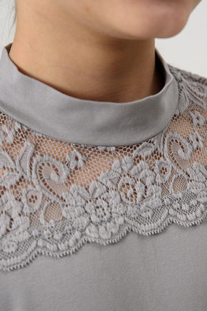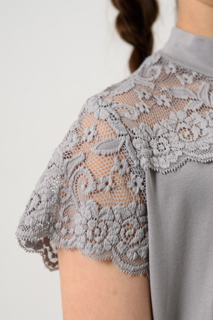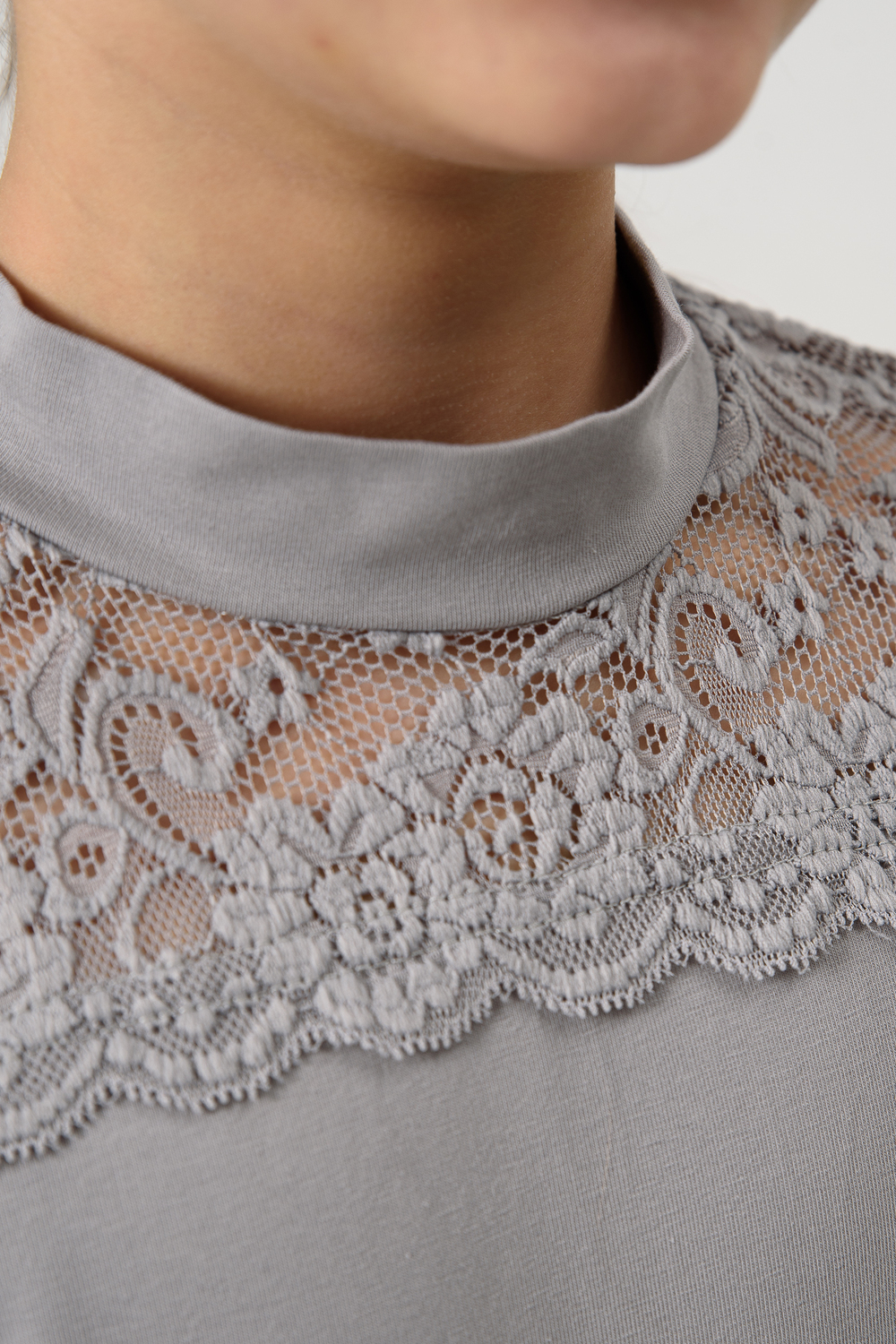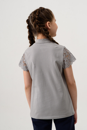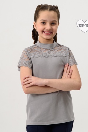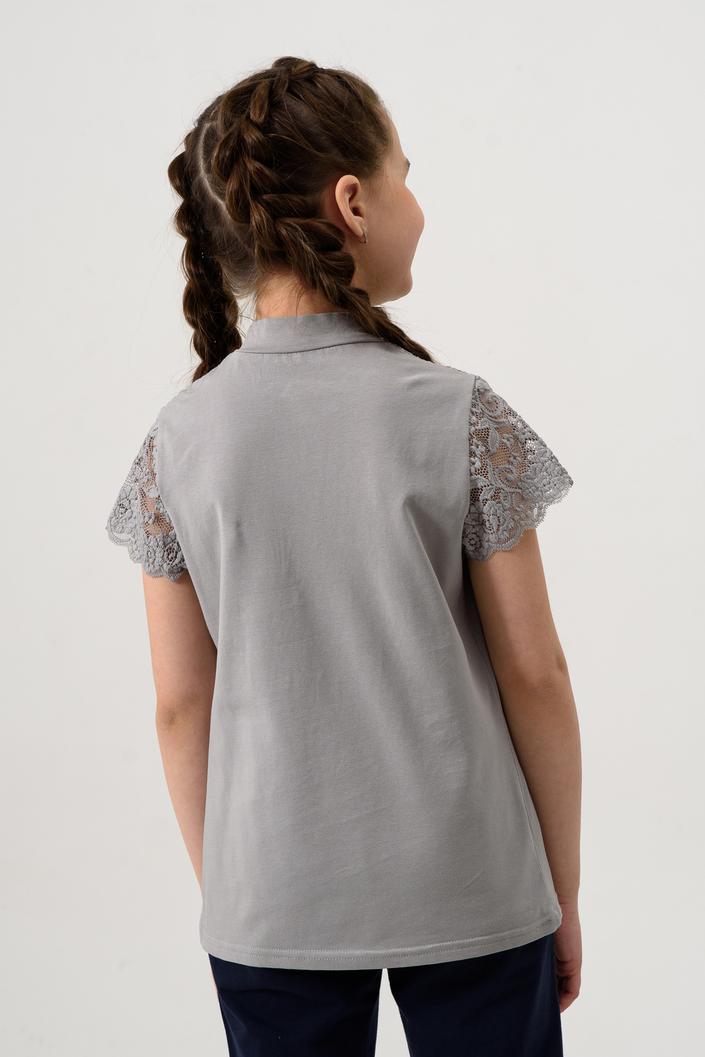 Блузка для девочек младшего и старшего школьного возраста, из трикотажного однотонного полотна – кулирка с лайкрой и эластичного кружева (дизайн и ширина кружева может меняться). Блузка полуприлегающего силуэта, с втачным коротким рукавом, с воротником – стойкой. Спереди отрезная кружевная кокетка. На спинке отсутствуют линии членения. Рукав одношовный, выполнен из эластичного кружева. Низ изделия подогнут.