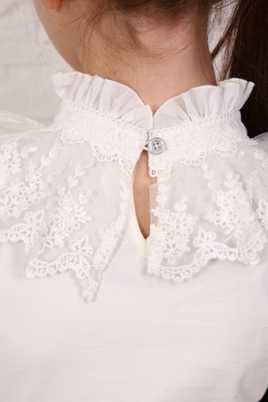 Джемпер для девочек младшего и старшего школьного возраста, из основного материала: однотонная кулирка с лайкрой и отделочного материала: шифон и кружево (дизайн кружева может меняться). Джемпер полуприлегающего силуэта, с втачным рукавом, с застежкой на спинке на петли и пуговицы, с пелериной и стойкой в горловине. Спинка, перед, стойка и манжеты выполнены из основного материала, рукава, рюшка и бант – из шифона, пелерина и нашивка на рукав – из кружева. На детали переда отсутствуют линии членения. Спинка с разрезом под застежку. Рукава одношовные, длинные, на манжетах. По окату рукавов небольшая сборка. По низу рукава собраны на резинку. На рукава снизу нашито кружево. Стойка горловины с рюшкой по верхнему краю. На стойку настрочена кружевная тесьма. Пелерина из кружева присборена. Сбоку на пелерину настрочен бант. Низ изделия подогнут.