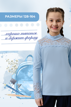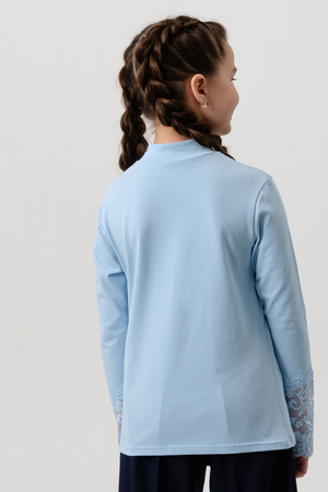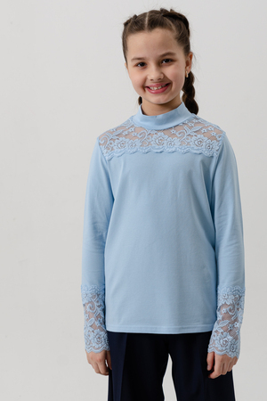 Блузка для девочек младшего и старшего школьного возраста, из трикотажного полотна – однотонная кулирка с лайкрой и кружева (дизайн и ширина кружева может меняться). Блузка прилегающего силуэта, с втачным рукавом, с воротником – стойкой. Спереди отрезная кокетка из кружева. На спинке отсутствуют линии членения. Рукав длинный одношовный. По низу рукава настрочено широкое кружево. Низ изделия подогнут.