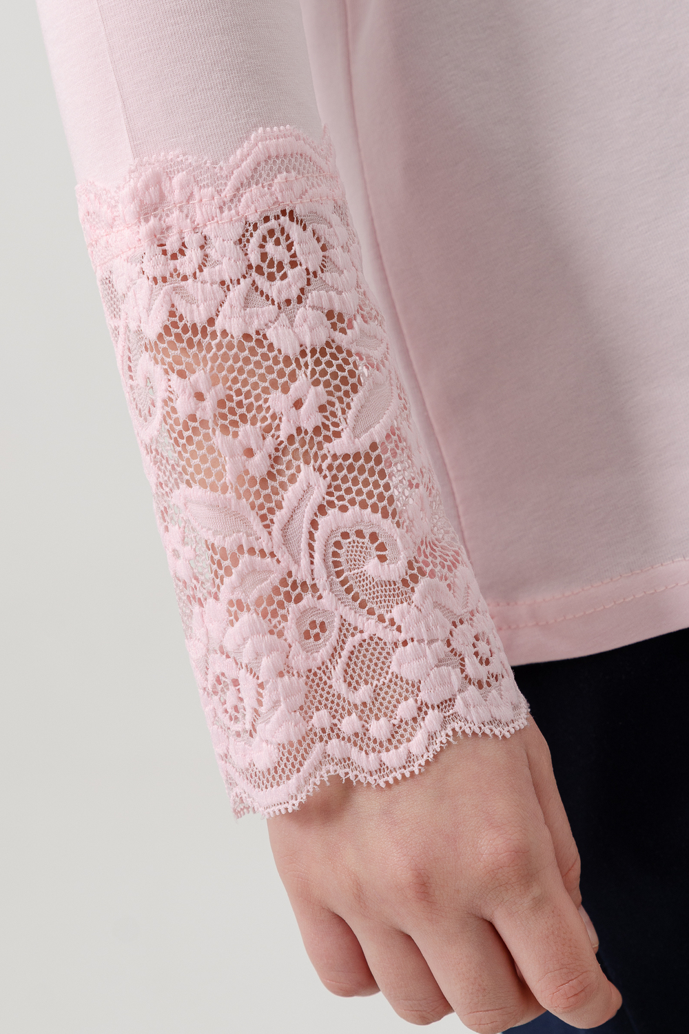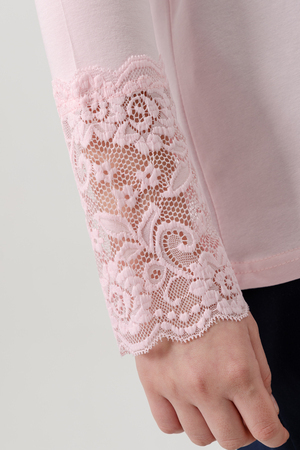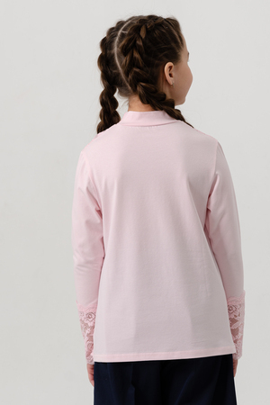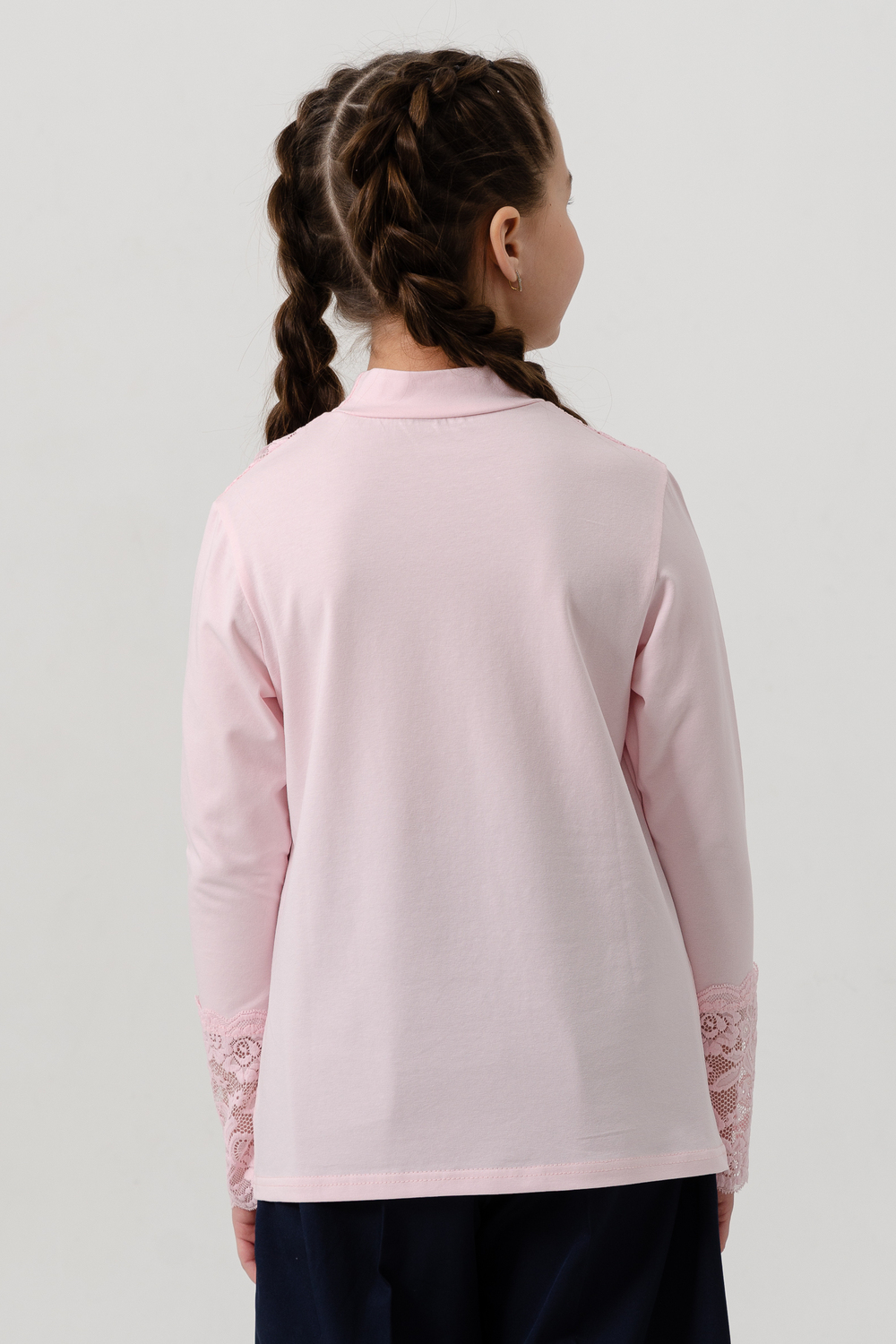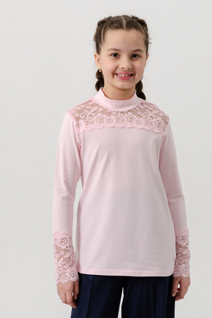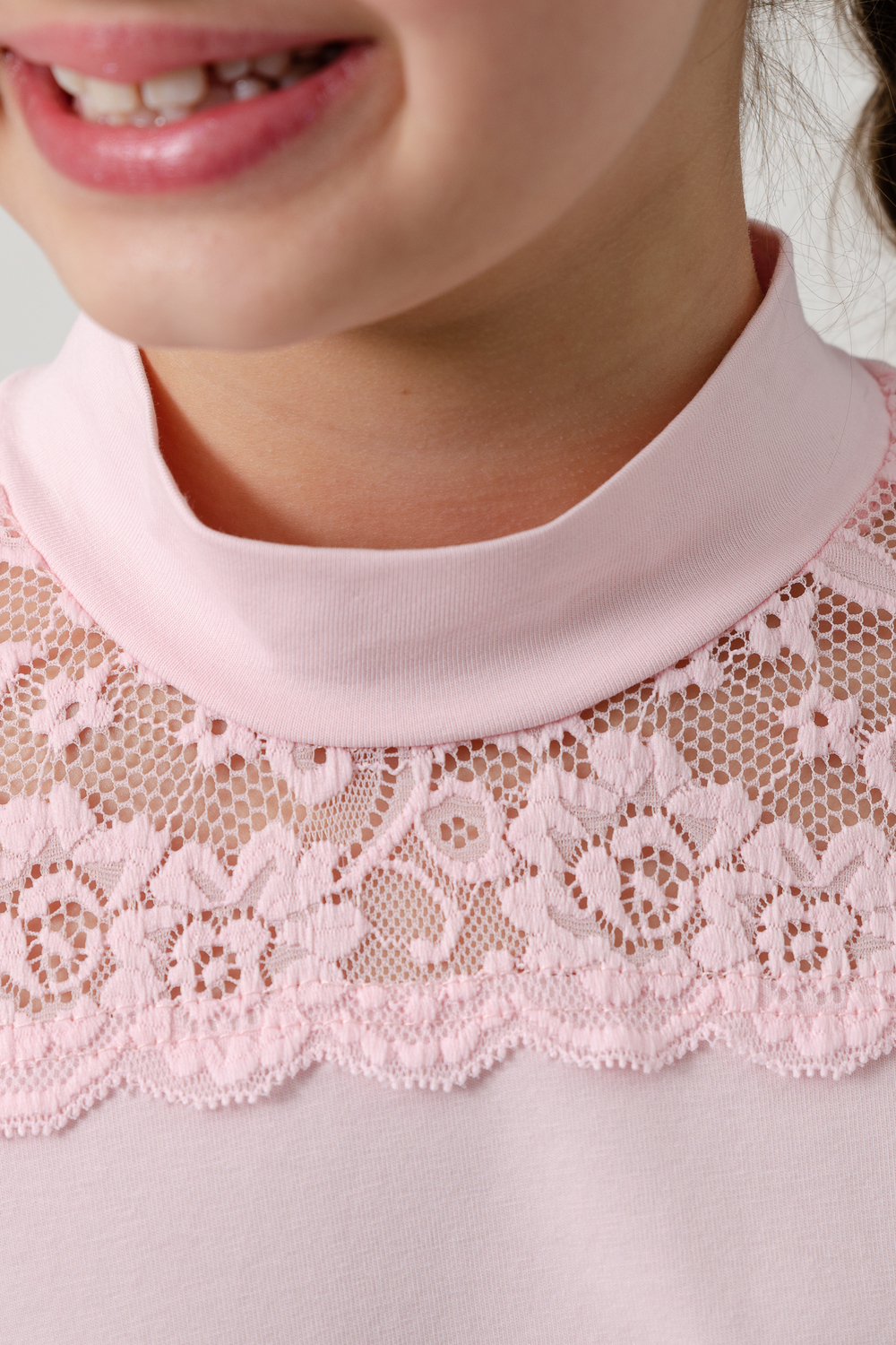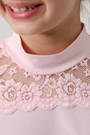 Блузка для девочек младшего и старшего школьного возраста, из трикотажного полотна – однотонная кулирка с лайкрой и кружева (дизайн и ширина кружева может меняться). Блузка прилегающего силуэта, с втачным рукавом, с воротником – стойкой. Спереди отрезная кокетка из кружева. На спинке отсутствуют линии членения. Рукав длинный одношовный. По низу рукава настрочено широкое кружево. Низ изделия подогнут.