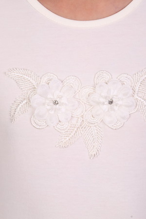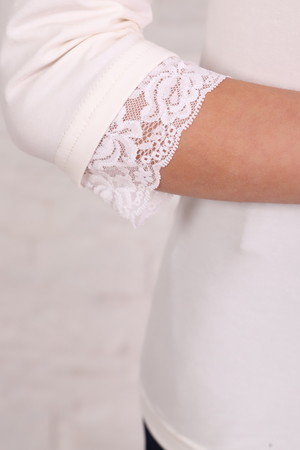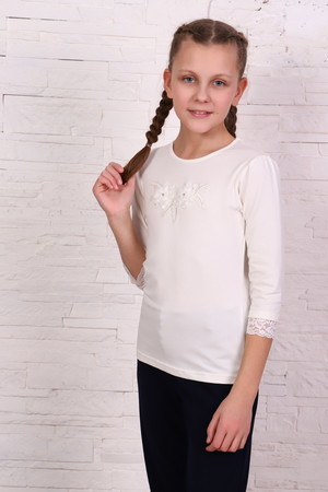 Блузка для девочек младшего и старшего школьного возраста, из однотонного трикотажного полотна - кулирка с лайкрой. Блузка полуприлегающего силуэта, с втачным рукавом, без застежки. Спереди и на спинке отсутствуют линии членения. Срез горловины обработан узкой окантовочной лентой из того же полотна в 4 сложения. Рукав одношовный, длина 3/4, присборенный по окату. Низ рукава с манжетой из кружева. На передней части джемпера кружевная нашивка.