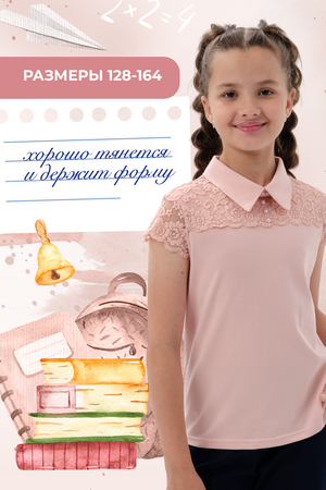 Блузка для девочек младшего и старшего школьного возраста, из однотонного трикотажного полотна кулирка с лайкрой. Блузка полуприлегающего силуэта, с втачным рукавом, с застежкой на одну пуговицу и петлю, с сорочечным воротником со стойкой. На деталь переда из кулирки с лайкрой настрочена кружевная кокетка. На детали спинки разрез под застежку. Рукав короткий из кружева. Воротник сорочечный с отрезной стойкой. По отлету и концам воротника, по шву притачивания стойки в горловину и шву стачивания стойки с воротником проложена отделочная строчка. На кокетку переда по центру приклеены полубусины. Дизайн кружева рукава и кокетки может меняться.