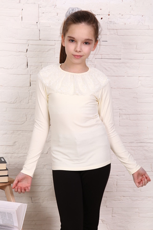 Блузка для девочек дошкольного, младшего и старшего школьного возраста, из однотонного трикотажного полотна кулирка с лайкрой. Блузка полуприлегающего силуэта, с втачным рукавом, без застежки. Спереди и на спинке отсутствуют линии членения. Срез горловины обработан узкой окантовочной лентой из того же полотна в 4 сложения, с вложением присборенного кружева. Рукав одношовный, длинный. Низ рукава без манжеты, подогнут.