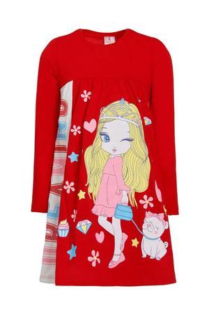 Платье из хлопкового трикотажа, кулирка. Полочка отрезная, выше линии талии. Длинные рукава. Изделие украшено принтом на нижней части полочки.