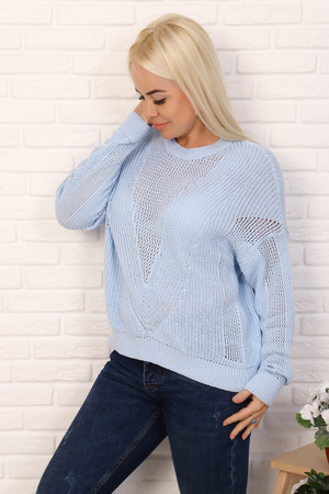 Джемпер имеет рельефный рисунок в виде полупрозрачного выреза, что отлично подчеркивает линию декольте, рукав летучая машь. Само изделие полуприлегающее с округлой горловиной, линия плеча спущена, низ изделия заужен.