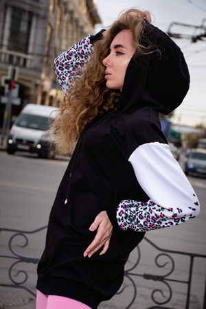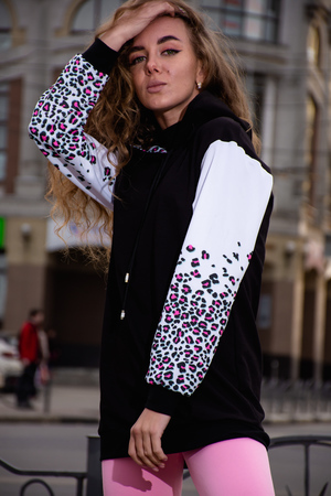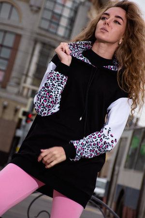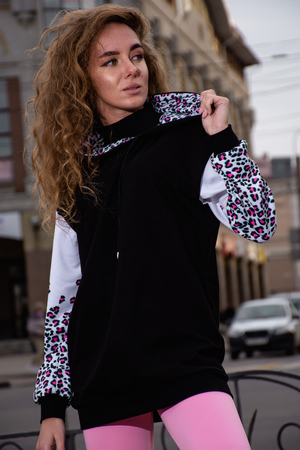Стильная удлиненная толстовка из футера. Низ изделия и рукава обработаны манжетом из рибаны. На рукавах нежный анималистичный принт. Подойдет для офисного стиля и прогулок в прохладную погоду.
