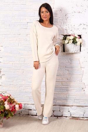 Вязаный костюм из эко-кашемировой пряжи - вещь не только теплая и приятная к телу, но и очень стильная. Джемпер с брюками на резинке и шнуре можно надеть на прогулку, на шопинг или на встречу в модное кафе.