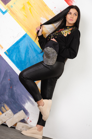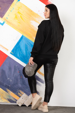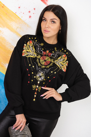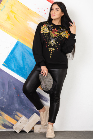 Толстовка свободного кроя с оригинальным принтом в виде орнамента, украшением которого является золотой глиттер. Эта модель хорошо сочетается как с джинсами, так и с брюками и юбками. Горловина, манжеты рукавов и низа изделия изготовлены из плотной, качественной резинки кашкорсе, которая при эксплуатации не растягивается. В характеристиках длина рукава указана от точки основания шеи вместе с манжетой.
