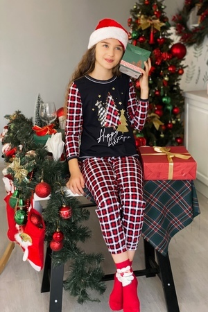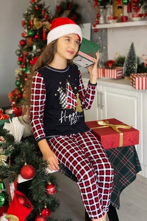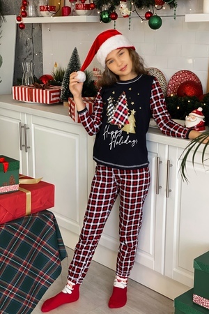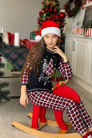 Комплект сосотоит из туники и брюк. Туника прямого силуэта, с округлой горловиной. Рукав втачной, длинный. Горловина и низ рукавов обработаны бейкой из отделочного полотна. Брюки прямые, длинные, на резинке. Низ брюк собран на резинку.