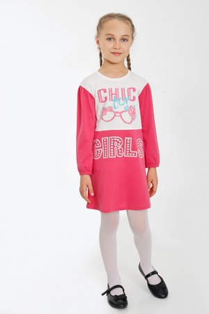 Платье из легкой, хлопковой ткани 2-х расцветок, расклешенное книзу. Рукав со спущенным плечом, по окату с небольшой сборкой и внизу на резинке. Горловина отделана узкой обтачкой из эластичной ткани. Полочка украшена шелкографией. Ткань гипоаллергенная хорошо пропускает воздух.