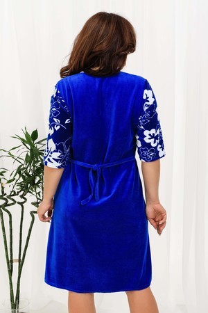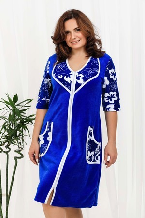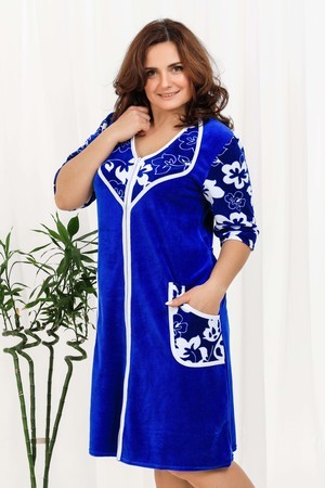 Элегантный женский халат из велюра. Дизайн в виде белых цветочных силуэтов, белая окантовка, застегивается на молнию, рукава чуть ниже локтей, по бокам накладные карманы, общая длина приблизительно до коленей.