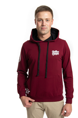 Кофта мужская с капюшоном из 2-х нитки пенье. Карман-кенгуру, пояс и манжеты из кашкорсе. Модель имеет печать на полочке, рукавах и кармане.