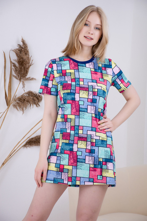 Домашняя туника-платье свободного кроя, отделка ворота однотонной тканью, короткий рукав