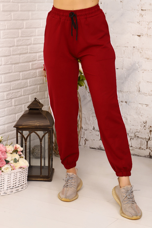 Брюки женские спортивного силуэта. Модель длиной 7/8, с карманами. Пояс на резинке и завязках. Низ на резинке. По боковому шву лампасы из двух белых полосок.