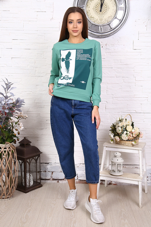 Толстовка женская из футера. Представлена в двух цветах. Спереди толстовки выполнена печать. Рукава, горловина и низ изделия отделаны манжетой