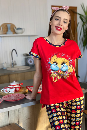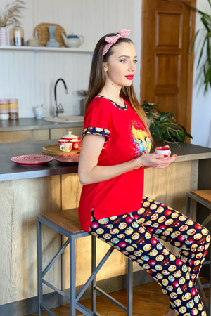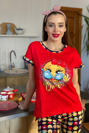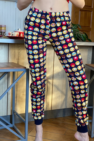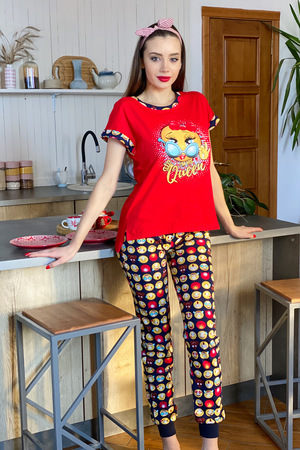 Костюм женский состоит из футболки и брюк. На полочке принт. Брюки на манжете, карманы в боковых швах.