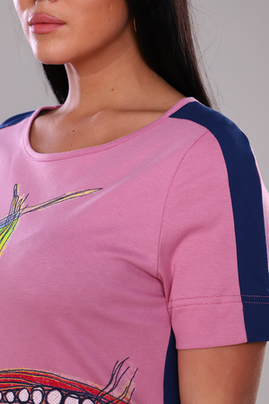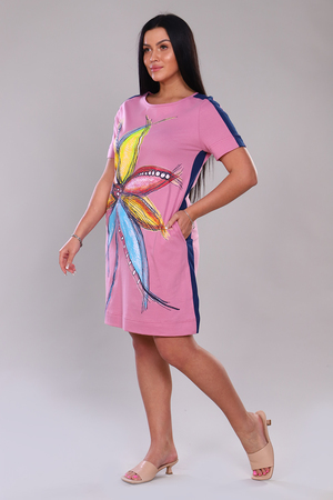 Туника женская, выполнена из трикотажного полотна, 100% хлопок. Горловина круглой формы, с боковыми карманами и ярким принтом. Рукава и бока оформлены вставками из контрастной ткани.