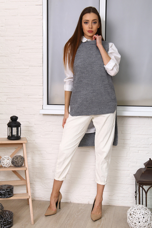 Жилет спереди укороченный, сзади длинный, имеет округлый вырез. Снизу скошенный угол украшен поперечными полосами. Замечательно смотрится с блузкой, рубашкой или водолазкой. Очень модная модель этого сезона.