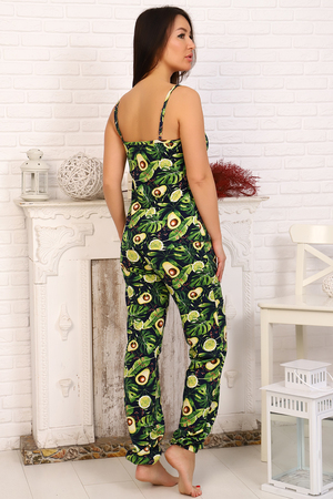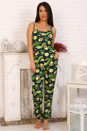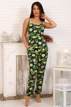 Комплект для сна и отдыха, состоящий из топа и брюк, выполнен из легкого приятного к телу трикотажа. Бретели на топе регулируются. На брюках небольшие внутренние кармашки, притачной пояс на резинке, низ брюк собран на резинку. Пижама с оригинальным трендовым в этом сезоне принтом выглядит стильно и эффектно. Модель идеально подойдет как для сна, так и для занятий домашними делами. Замеры резинки на брюках указаны без растягивания.