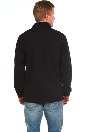 Мужская рубашка из футера. Воротник-поло на пуговицах, на кокетке небольшая текстовая печать. На полочке накладной карман. Длинный рукав на манжете