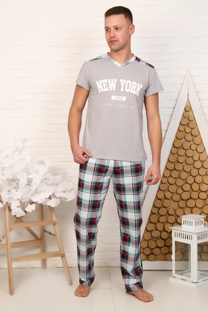 Костюм мужской футболка и брюки. Футболка прямого силуэта с коротким втачным рукавом. Горловина V-образной формы, обработана воротником стойкой. На полочке изделия принт. Декоративный элемент погоны. Низ рукава и футболки подогнут. Брюки прямого силуэта с притачным поясом. Карманы формы "хулиган". Низ изделия подогнут.