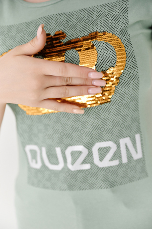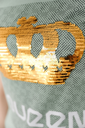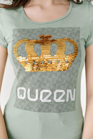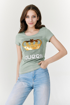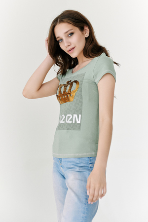 Футболка полуприлегающего силуэта, с округлой горловиной, длиной до середины бедра. Рукав втачной короткий. Горловина обработана бейкой из основного полотна. На полочке эффектная печать из пайеток