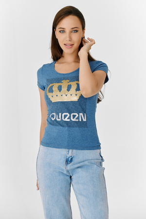 Футболка полуприлегающего силуэта, с округлой горловиной, длиной до середины бедра. Рукав втачной короткий. Горловина обработана бейкой из основного полотна. На полочке эффектная печать из пайеток