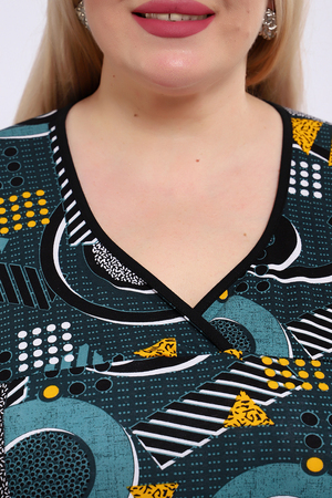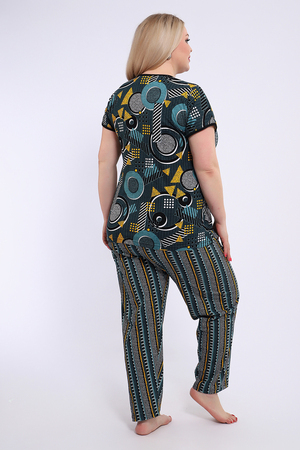 Костюм состоит из блузки и брюк. Брюки полной длины с притачной резинкой, низ изделия обработан швом в подгибку. Блузка со спущенной проймой, по бокам два функциональных кармана.