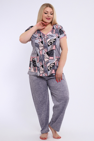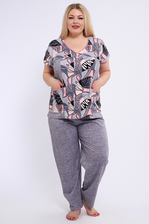 Костюм состоит из блузки и брюк. Брюки полной длины с притачной резинкой, низ изделия обработан швом в подгибку. Блузка со спущенной проймой, по бокам два функциональных кармана.
