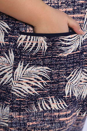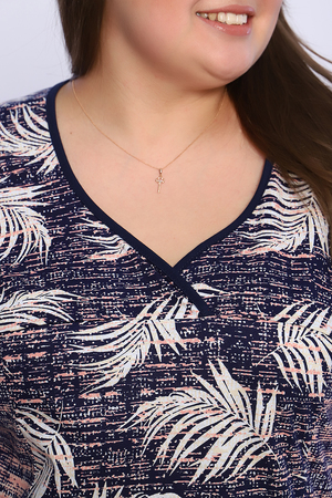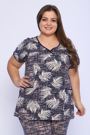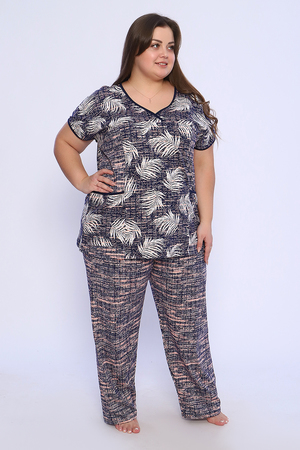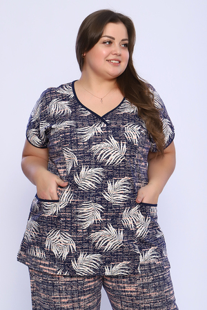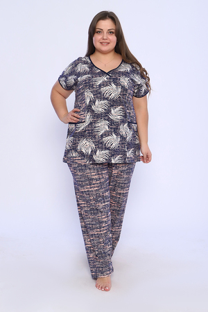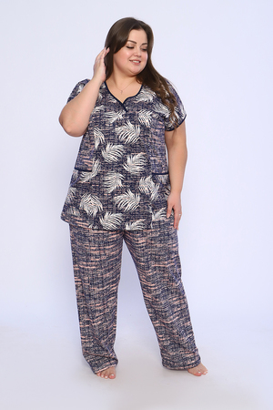 Костюм состоит из блузки и брюк. Брюки полной длины с притачной резинкой, низ изделия обработан швом в подгибку. Блузка со спущенной проймой, по бокам два функциональных кармана.