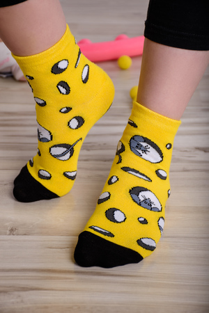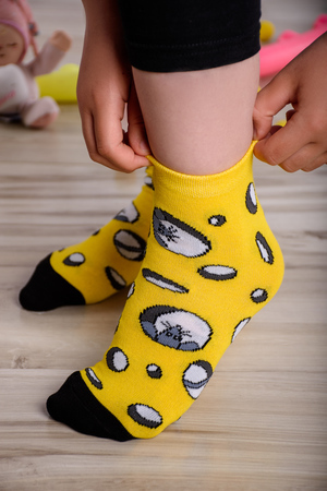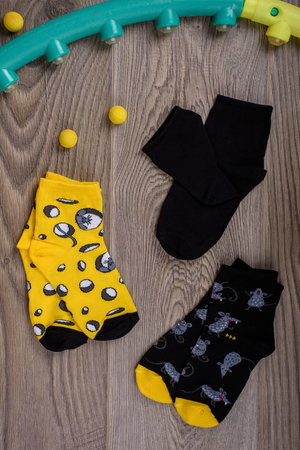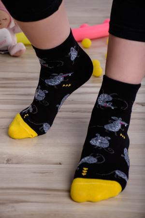 Яркий набор женских носков с милыми мышатами. В упаковке 3 пары в спайке под крючок (2 носка с рисунком, 1 однотонный черный). Упаковка - пакет