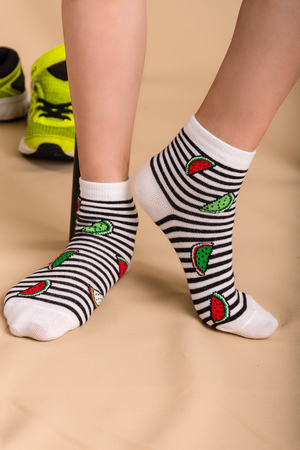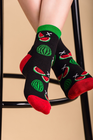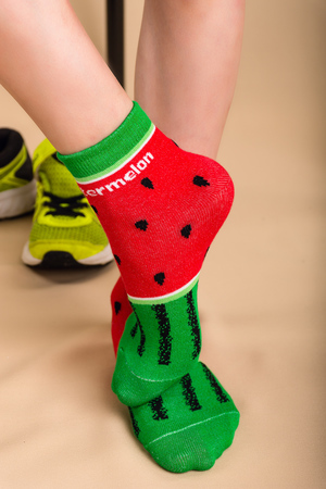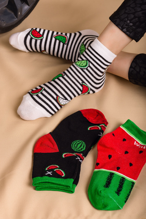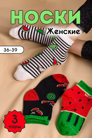 Яркий набор женских носочков с рисунками в виде сочных арбузов. В упаковке 3 пары в спайке под крючок, упаковка - пакет